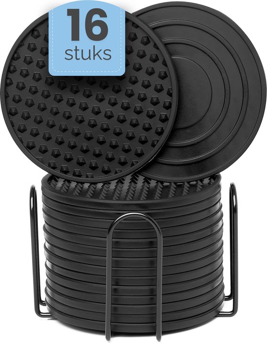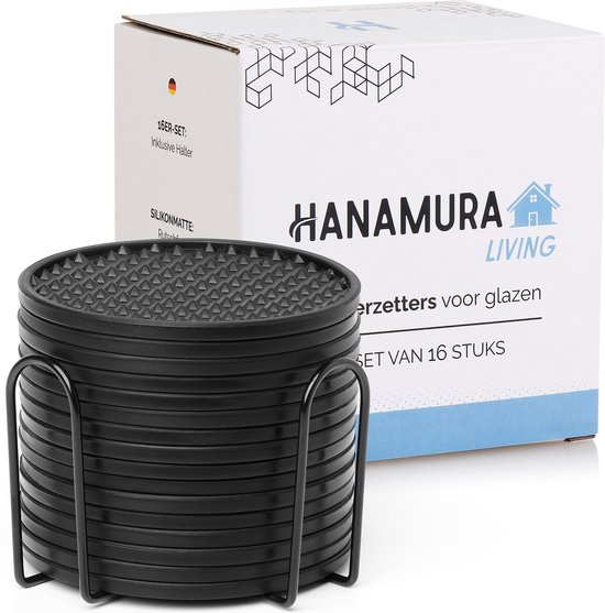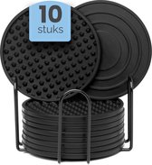 Hanamura Sous-verres pour Verres - Sous-verres Design en Siliconen avec Support - Set de 16 pièces - Rond - Zwart - 10 cm de diamètre