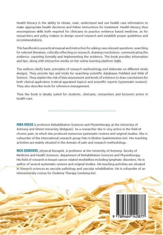 Health literacy is the ability to obtain, read, understand and use health care information to make appropriate health decisions and follow instructions for treatment. Health literacy thus encompasses skills both required for clinicians to practice evidence based medicine, as for researchers and policy makers to design sound research and establish proper guidelines and recommendations. This handbook is a practical manual and instruction for asking case relevant questions, searching for relevant literature, critically reflecting on research, drawing conclusions, communicating the evidence, reporting formally and implementing the evidence. The book provides information and tips, along with interactive media on the online learning platform Sofia. The authors clarify basic principles of research methodology and elaborate on di¬fferent study designs. They provide tips and tricks for searching scientific databases PubMed and Web of Science. They explain the risk of bias assessment and levels of evidence to draw conclusions for both clinical application (critical appraised topics) and scientific reports (systematic reviews). They also describe tools for reference management. Thus the book is ideally suited for students, clinicians, researchers and lecturers active in health care.