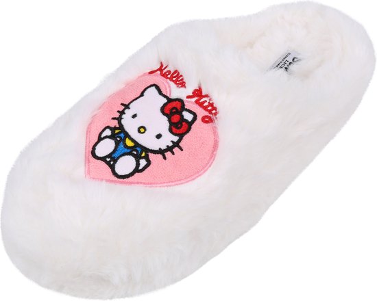 Adorables chaussons en peluche Hello Kitty blancs, avec une image brodée du personnage populaire sur un cœur rose.