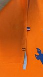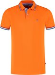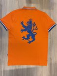 Polo homme à manches courtes de couleur orange, Klein logo et drapeau néerlandais visibles dans le col et la manche. Grand lion bleu imprimé au dos.