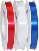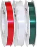 Hobby/déco cadeau de luxe rubans décoratifs rouge/blanc/vert 1,5 cm x 91 mètres. Set de 3x rouleaux. Ce ruban est fait d'une qualité luxueuse et est extra long. Taille par ruban de couleur : 1,5 cm / 15 mm de large, au total 91 mètres de long. Hobby-temps / bricolage matériaux de base. Le matériel de passe-temps fournit du ruban pour faire des décorations ou emballer des cadeaux.