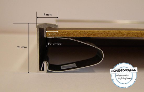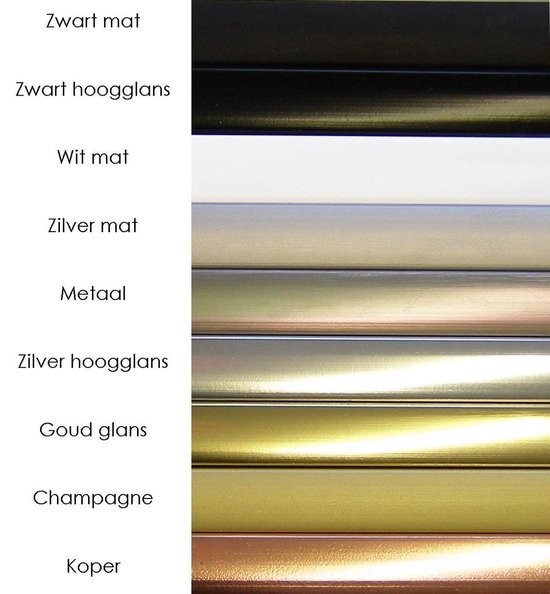 Le cadre photo en aluminium Kampen convient pour une image de 46x68 cm. Cette taille (photo) est égale à la taille du verre du cadre. Attention: une partie du bord du cadre recouvre l'image. Vous souhaitez éviter ce chevauchement ? Commandez cette liste en combinaison avec un passe-partout. La paroi arrière en MDF et le verre artificiel antireflet sont faciles à retirer, de sorte que vous pouvez facilement changer les images vous-même.