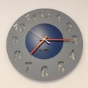 Horloge murale moderne en acier inoxydable dans une laque grise mate vaporisée d'un cercle en acier inoxydable bleu brillant. Equipé d'aiguilles orange frappantes.