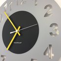 Horloge murale moderne en acier inoxydable dans une laque grise mate pulvérisée d'un cercle en acier inoxydable noir imposé. Equipé d'aiguilles jaunes frappantes.