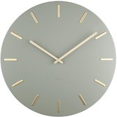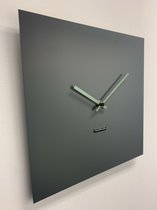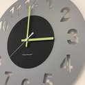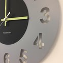 Horloge murale moderne en acier inoxydable pulvérisé dans une laque grise mate. Equipé d'aiguilles vertes frappantes et d'une trotteuse blanche.