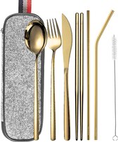 Contenu : 1 cuillère, 1 fourchette, 1 couteau, 1 paire de Baguettes, 2 Pailles réutilisables, 1 brosse de Pailles, 1 étui de rangement.