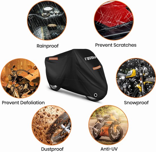 Housse de moto Favoto imperméable et résistante à l' Plein air , tissu Oxford 210T, anti-UV, anti-rayures, résistante à la chaleur, avec bandes réfléchissantes, pour scooter, cyclomoteur, motocross, 220 x 105 x 125 cm