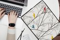 Motifs d'oiseaux colorés volant sur des feuilles blanches.