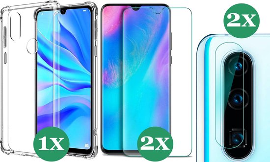 Huawei P30 Lite Case Transparent Shock Case - 1x Huawei P30 Lite Case + 2x Screen Protector Glass + 2x Camera Screen Protector