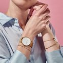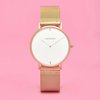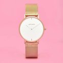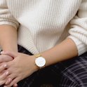 Serena, avec son bracelet en maille dorée et son cadran blanc, nous rappelle le spectacle majestueux du soleil à son apogée quotidienne.