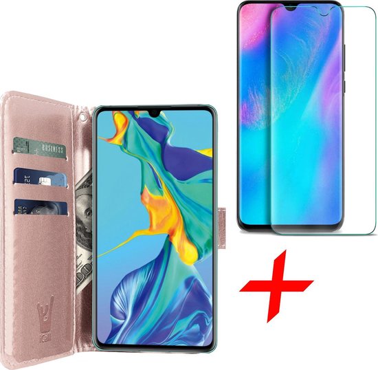 iCall - Huawei P30 Case + Screenprotector Tempered Glass - Cuir TPU Book Case Wallet Flip Wallet - Rose Gold