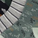 Jolies chaussettes pour bébé avec différents imprimés en vert, gris et bleu foncé.