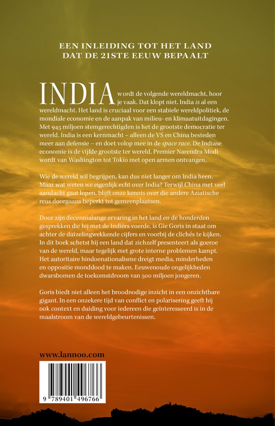 Door zijn decennialange ervaring in het land en de honderden gesprekken die hij met de Indiërs voerde, is Gie Goris in staat om achter de duizelingwekkende cijfers en voorbij de clichés te kijken. In dit boek schetst hij een land dat zichzelf presenteert als goeroe van de wereld, maar tegelijk met grote interne problemen kampt. Het autoritaire hindoenationalisme dreigt media, minderheden en oppositie monddood te maken. Eeuwenoude ongelijkheden dwarsbomen de toekomstdroom van 500 miljoen jongeren.
