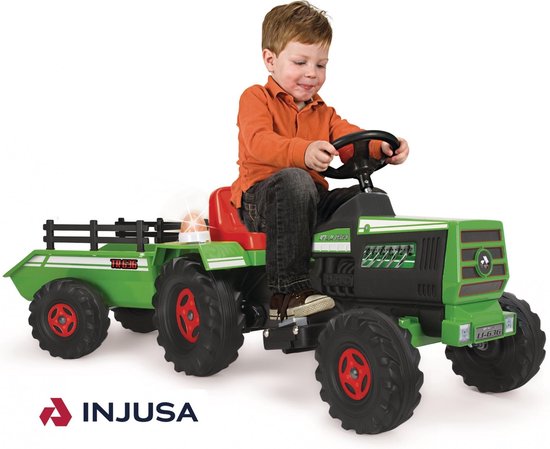Tracteur Injusa basic + remorque avec batterie 6 volts. Avec lumière et son clignotants. Vitesse: 2 km / h. Convient aux enfants à partir de 1 an. Dimensions du produit: 136 x 52 x 50 cm.
