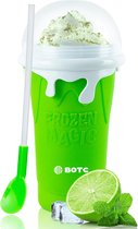 Une tasse originale pour s'amuser à faire des slushies et des glaces rapides et saines, car elles peuvent être fabriquées à la maison à partir d'ingrédients naturels. Le design moderne et jeune séduit les enfants et les adultes et stimulera leur imagination et leur créativité. Les possibilités sont infinies. Idéal pour se rafraîchir dans la chaleur estivale. Il se compose d'une tasse de 150 ml, d'un noyau de congélateur, d'une cuillère et d'un manuel avec des recettes. Il est facile à nettoyer et très facile à utiliser. Avant utilisation, il doit être placé au congélateur (environ -18 ° C) pendant au moins 4 à 6 heures, bien que nous vous recommandons de toujours le laisser au congélateur afin qu'il soit prêt à être utilisé lorsque vous en avez besoin. Lorsque vous le sortez du congélateur, versez le liquide (de préférence froid pour de meilleurs résultats) dont vous souhaitez faire une slushie ou une glace, mélangez-le avec la cuillère (pendant 5 à 7 minutes pour faire une slushie et 7 up à 10 minutes pour faire de la glace), en le grattant sur les côtés de la tasse une fois que le liquide commence à geler.