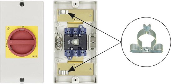 Commutateur de maintenance EMV KG 3 pôles Spécifications techniques.: Raccordement (composants) : Vis · Nombre de pôles : 3 · Type d'actionneur : Interrupteur rotatif d'arrêt d'urgence · Dimensions Filetage : M20 Dimensions, largeur : 85 mm Dimensions, profondeur : 90 mm Dimensions, hauteur : 120 mm Type de contact (LoV) : 1x NO, 1x NC Fonctions (interrupteur/bouton) : à enclenchement Convient pour : Raccordement à vis M20 Contenu : 1 pièce Couleur du boîtier/bouton : Rouge, Jaune Type de montage : Opbouw Motif d'impression : 0 Caractéristiques de l'interrupteur/bouton : Désactivable Angle de commutation : 1 x 90 ° Type d'interrupteur/bouton (LoV) : Interrupteur de réparation Type (type fabricant) : KG10 T203/D-A076 KS51V Conception : Verrouillable en position 0 Indice de protection : IP66/IP67 Puissance : 5,5 kW