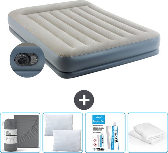 Intex Airbed Set - 2 Personnes - 152 x 203 x 30 cm - Grijs - Avec Pompe Intégrée + Hoeslaken Housse Anthracite + Oreiller + Taies d'oreiller Molton 2 en 1 + Kit de Réparation