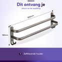 Le porte-serviettes a une largeur de 60 cm, ce qui le rend parfait pour les salles de bains de taille moyenne à grande. La double tringle offre de nombreuses options de suspension, tandis que le design élégant garantit que votre salle de bain conserve une apparence soignée et raffinée.