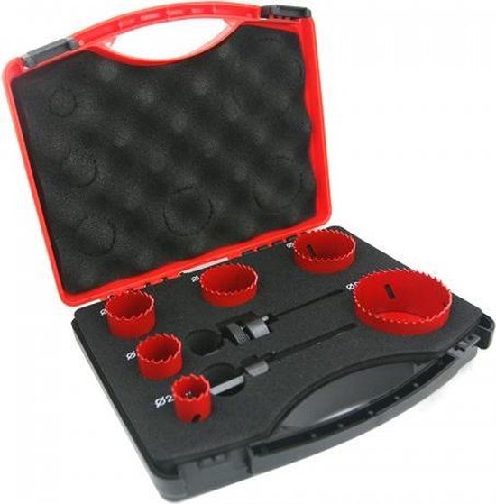 Ensemble de scies-cloches 8 pièces Contenu : 1x ø 22, 29, 35, 44, 51 et 68mm 1x adaptateur 14-30mm (6 nœuds. 9) 1x adaptateur 32-210mm (6 nœuds. 9)