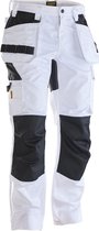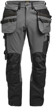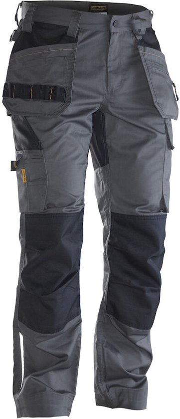 Pantalon de travail en polyester/coton facile d'entretien qui conserve sa couleur et sa forme. Le pantalon a des panneaux extensibles à l'arrière pour plus de flexibilité, des poches avant spacieuses, des poches holster amovibles avec des poches supplémentaires et une fermeture éclair supplémentaire, des poches arrière avec rabat, une poche sur la jambe avec une poche supplémentaire et un rabat avec fermeture Velcro et un mètre pliant. poche avec espace pour un couteau. Les poches pour genouillères sont renforcées et les genouillères peuvent être placées à deux hauteurs. Le pantalon peut être rallongé de 5 cm au niveau de l'ourlet.