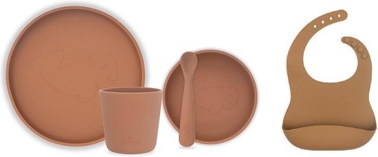 Jollein de dîner Jollein| Service de vaisselle pour enfants 4 pièces | Silicones | caramel + bavoir avec récipient | silicone | dîner |vaisselle pour enfants | cadeau de maternité | nouveau née |nourrisson | enfant