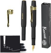 Set(3 pièces). Cadeau original pour petits et grands. STYLO PLUME Kaweco CLASSIC SPORT avec pointe en acier, Kaweco SPORT Nostalgie Oktogonal Clip Vergoldet, Boîte de 6 recharges Kaweco noires. Le stylo plume mesure 10,5 cm de long avec capuchon fermé. Avec le capuchon à l'arrière, le stylo mesure 13,5 cm et se sent bien dans la main. Le stylo plume Kaweco Sport est doté d'une plume en acier fabriquée par la société allemande Bock Heidelberg. Les garnitures peuvent être commandées séparément et sont disponibles en différentes couleurs. Les cartouches d'encre Kaweco sont livrées dans une boîte de 6 pièces. Ce sont des cartouches d'encre standard internationales et elles s'adaptent à tous les stylos -plumes Kaweco et à la plupart des stylos-plumes d'autres marques. Il y a plus de belles couleurs à commander. Marron caramel (sépia), Yellow Surligneur (jaune), Blue midnigt (Blue noir), vert paume (vert), bleu Paradise (turquoise), noir Pearl (Zwart ), Blue Royal ( Blauw), rouge rubis (rouge), fumé Gris (Grijs), violet d' Summer (aubergine), Orange Sunrise ( Oranje).