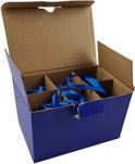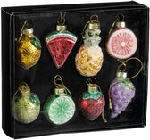 Boîte de rangement contenant six décorations de Noël pour le sapin. Les décorations sont fournies avec un ruban bleu pour les attacher.