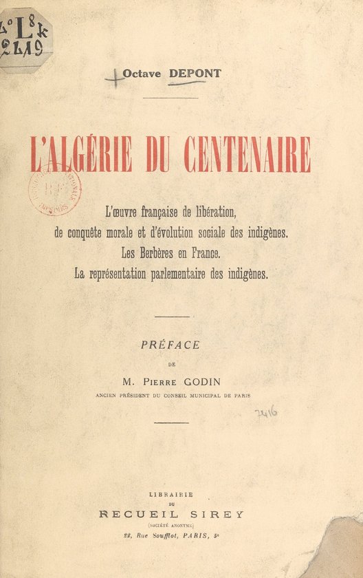 L'Algérie du centenaire L'œuvre française de libération, de conquête morale et d'évolution sociale des indigènes. Les Berbères en France. La représentation parlementaire des indigènes