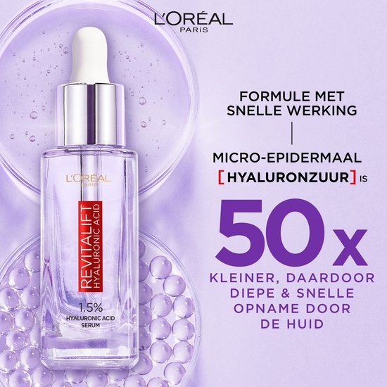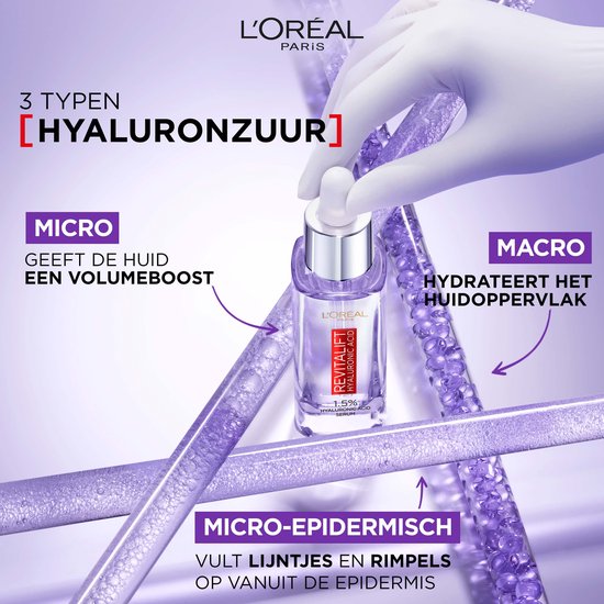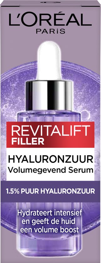 L’Oréal Paris Revitalift Sérum filler à l’acide hyaluronique – Soin visage anti-ride - 30 ml Un sérum pour le visage pour une hydratation intense et une peau plus lisse et plus souple. Description produit Le sérum de comblement à l'acide hyaluronique Revitalift hydrate et donne de l'élasticité à la peau. Avec 1,5 % d'acide hyaluronique, ce sérum présente la plus forte concentration d'acide hyaluronique de tous les sérums de L'Oréal Paris. Améliore l'élasticité et la fermeté Aide à réduire visiblement l'apparence des rides. Convient à tous les types de peau Avec une concentration très élevée d'acide hyaluronique de 1,5%. La quantité de sérum peut être dosée exactement selon les besoins grâce à la pipette. Le résultat Immédiatement : La peau est intensément hydratée et apparaît visiblement plus pleine, plus lisse et plus souple. Après une semaine : la résilience de la peau est considérablement renouvelée, elle paraît plus ferme et plus tendue.