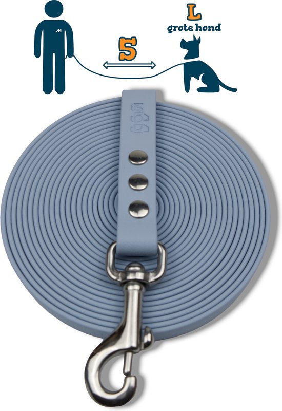 Laisse longue Miqdi - BioThane ® - bleu pastel - 5 mètres de long - 19 mm de large - L/XL - grand chien - laisse longue pour chien - sans poignée