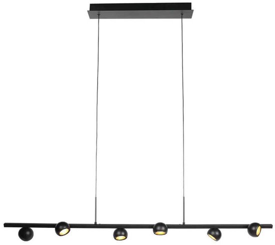 Design et possibilités de réglage : le cadre fin et allongé (120 cm de long et 10 cm de large) de la lampe est d'une élégante couleur noire et offre de la place pour six points lumineux LED intégrés. La lampe est réglable en hauteur (entre 90 cm et 140 cm), vous permettant de régler la hauteur parfaite après installation, en fonction de la pièce et de l'ambiance.