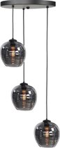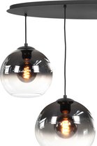 Une suspension unique avec trois tailles différentes de verres fumés est un véritable accroche-regard. La lampe est livrée avec une plaque de plafond noire mate de 100 centimètres de large. Les verres passent sans problème du fumé au clair.