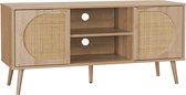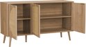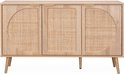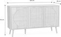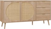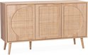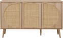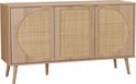 Le buffet EVA est parfait pour ajouter une touche élégante et fonctionnelle à votre intérieur. Grâce aux 2 niveaux de rangement dans les portes arrondies en rotin, vous pourrez ranger votre vaisselle, verres, couvertures et autres linges proprement et à l'abri des regards. Les cinq pieds robustes, dont un pied de renfort central, assurent stabilité et fiabilité.