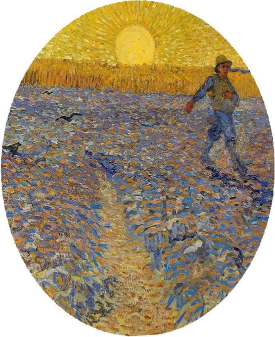 Toute l'attention tombe sur le terrain avec les mottes de terre, peintes d'une peinture épaisse, bleu-violet et orange, presque comme un relief. Le semeur fait son travail et le soleil domine la scène en tant que source éternelle de lumière et d'énergie. Ce qui frappe dans ce tableau, c'est que derrière le semeur, qui sème la terre labourée d'un large geste de bras, se tient toujours le maïs mûr. Avec cela, Van Gogh fait référence au cycle de la nature et de la vie. Le thème du semeur a aussi pour lui un aspect religieux: le semeur dans le champ est un modèle pour le semeur de la parole de Dieu.