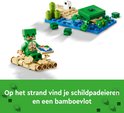 Les joueurs construisent une maison Minecraft en forme de tortue speelgoed avec des fenêtres, des lanternes, une porte, un lit, une table, un établi et un four. Un toit amovible permet d'accéder à l'intérieur. A l'extérieur se trouve une plage avec de la canne à sucre, des œufs de tortues et un radeau en bambou avec des rames. On y retrouve des figurines et des mobs bien connus de Minecraft : un guerrier en peau de tortue avec un casque, un noyé avec un trident, une tortue grignotant des herbiers marins et 3 bébés tortues.