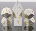 Les arts et les dés de Vera | Set de Dés en métal pour les RPG tels que Dungeons and Dragons | 7 pièces par ensemble | Argent Sunlight | Métal Wit brillant fini avec chiffres jaunes | Avec sac à dés