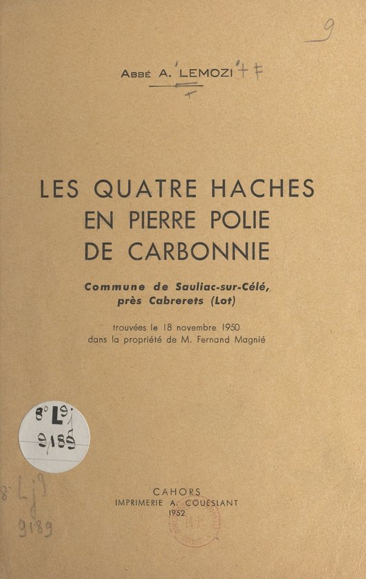 Les quatre haches en pierre polie de Carbonnie Commune de Sauliac-sur-Célé, près Cabrerets (Lot), trouvées le 18 novembre 1950 dans la propriété de M. Fernand Magnié