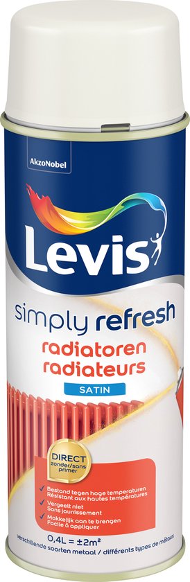 Peinture solvantée de haute qualité et satinée. Disponible en spray. Pour radiateurs et convecteurs électriques en fer, cuivre, aluminium, fonte, ... Convient également aux radiateurs déjà peints. Disponible en différentes couleurs et niveaux de brillance. Levis Radiatoren est facile à appliquer, ne s'écaille pas et ne se décolore pas. Jusqu'à 120 ° C Levis Radiateurs contient un agent antirouille. Applicable sans apprêt. Appliquer un apprêt antirouille uniquement sur les pièces rouillées.