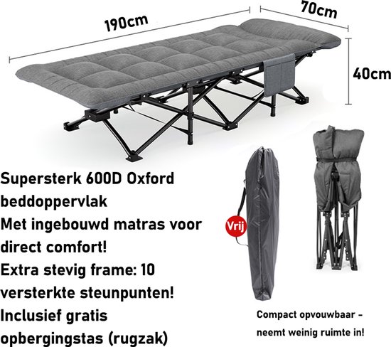 Lit de camping extensible 190x70x40 cm | Lit pliant jusqu'à 150 kg | Avec Matras intégré et poches latérales | Lit de camp stable avec sac de transport | Lit d'invité