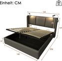 Lit double 160x200cm - Rangement, USB, tissu PU, sommier à lattes (sans matelas)