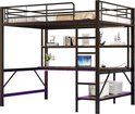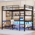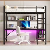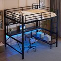 Lit mezzanine - 140x200 cm - escabeau - avec USB et prise - avec éclairage LED- bureau - sans matelas - noir
