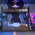 Lit mezzanine avec éclairage LED- 140 x 200 cm - tiroir - garde-corps - escalier - bureau - sans matelas - noir