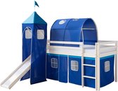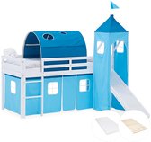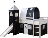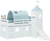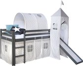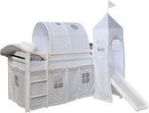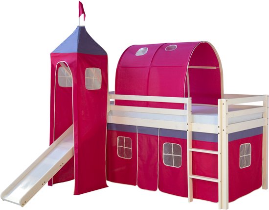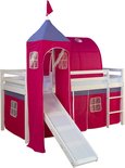 Ce lit mezzanine blanc robuste avec revêtement en tissu rose est un rêve pour la chambre de toute fille. Le rideau en tissu est fixé au cadre du lit à l'aide de boucles. Le rideau peut donc être retiré et lavé. Pour assembler le tunnel, utilisez les tiges en plastique fournies. Celui-ci est ensuite serré entre le matelas et le bord du lit. Selon la disposition de la pièce, l'échelle, le toboggan et la tour peuvent être montés à gauche ou à droite.