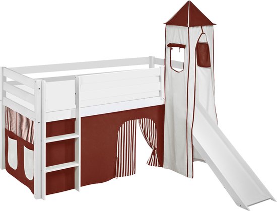 Lit mi-hauteur Marron-Beige avec tente, tour et toboggan. Un lit d'enfant beau et sûr pour la chambre de bébé !