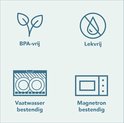 Les joints creux en silicone dans le couvercle garantissent que le pot de yaourt est 100 % étanche à l'air et à l'eau. Les produits (liquides) peuvent être stockés et transportés sans fuite et restent frais pendant des jours de plus.