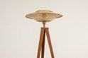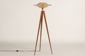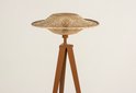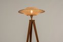 Lampadaire tripode avec abat-jour en rotin.