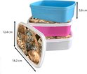 La taille de la corbeille à pain est de 18x12x6 cm. Cela rend la boîte à lunch assez grande pour votre déjeuner et également facile à transporter dans votre sac, par exemple.