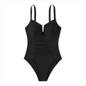 Ce maillot de bain noir élégant allie classe et confort. Les plis subtils et les détails en V dorés donnent un look luxueux. La partie ventre a un effet correcteur pour une silhouette flatteuse. Les bretelles réglables offrent un maintien optimal. Perfect pour une journée de plage chic ou une expérience spa relaxante.