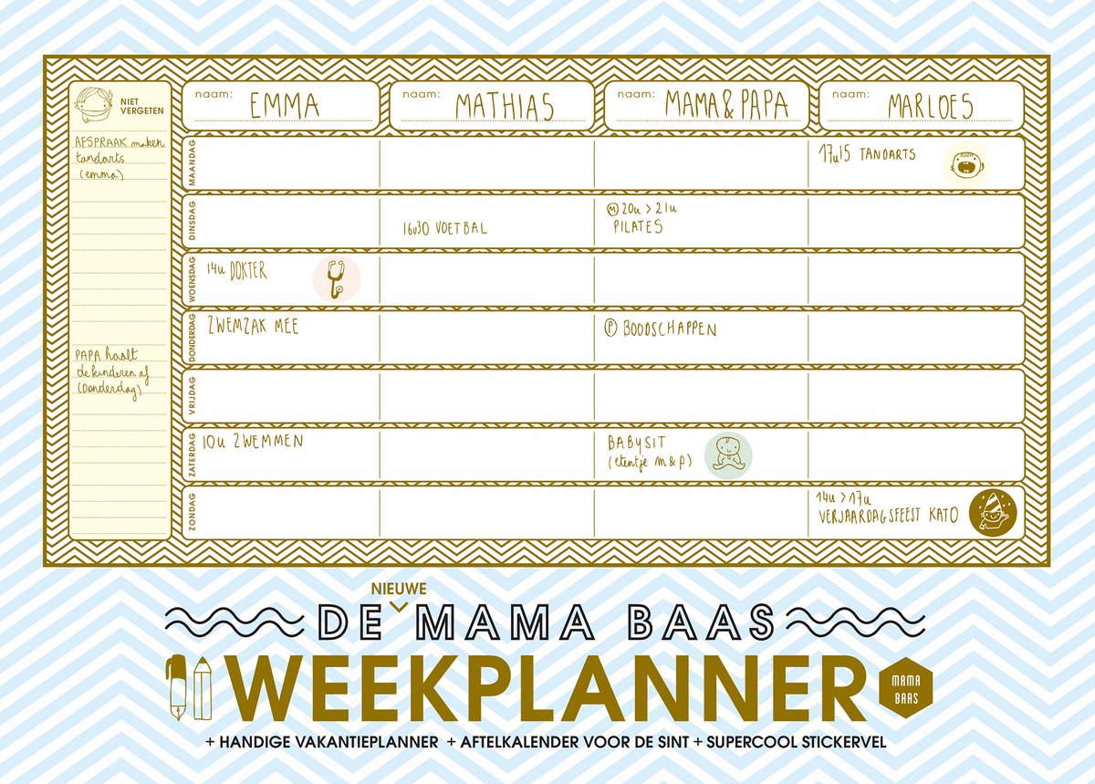 Met De nieuwe Mama Baas weekplanner heb je op ieder moment een helder en onmisbaar overzicht van alle weekactiviteiten van elk gezinslid, van klein tot groot.