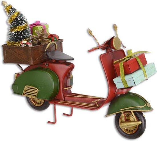 Joli modèle en tôle d'un scooter avec des colis de Noël et un sapin de Noël à l'arrière.